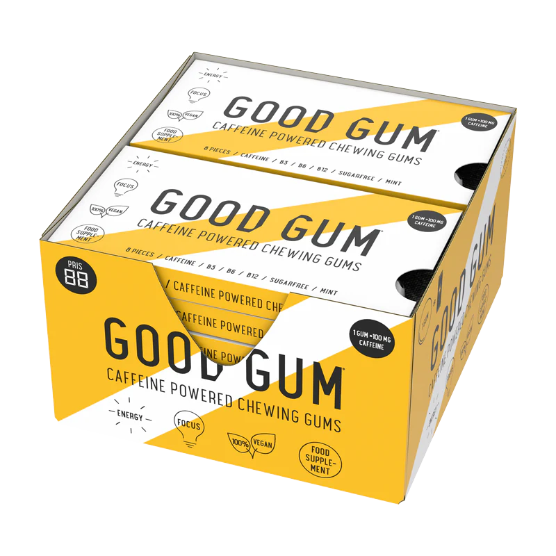 Ett dussin blisterförpackningar med energituggummi till ditt förfogande när situationen kräver ökad fokus eller en boost i fysisk prestanda. Varje blister innehåller 8 tuggummin.